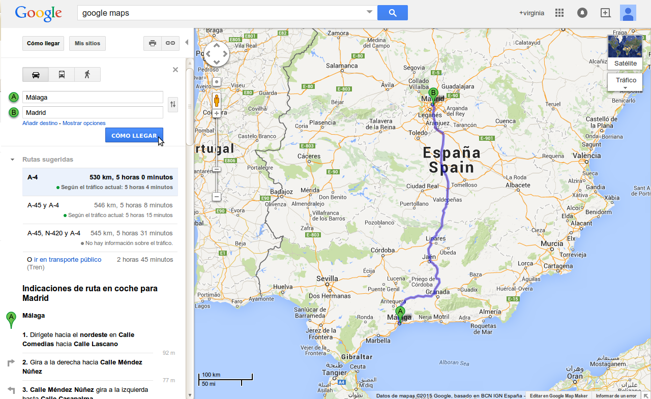 y ahora con los mas grandecitos de clase, hemos estado trabajando con google maps. La tarea era: buscar una ruta para hacer un viaje de Málaga a Madrid o Barcelona. A continuación tenían que explicar la ruta en un procesador de textos y copiar la imagen del mapa para ver la ruta.
